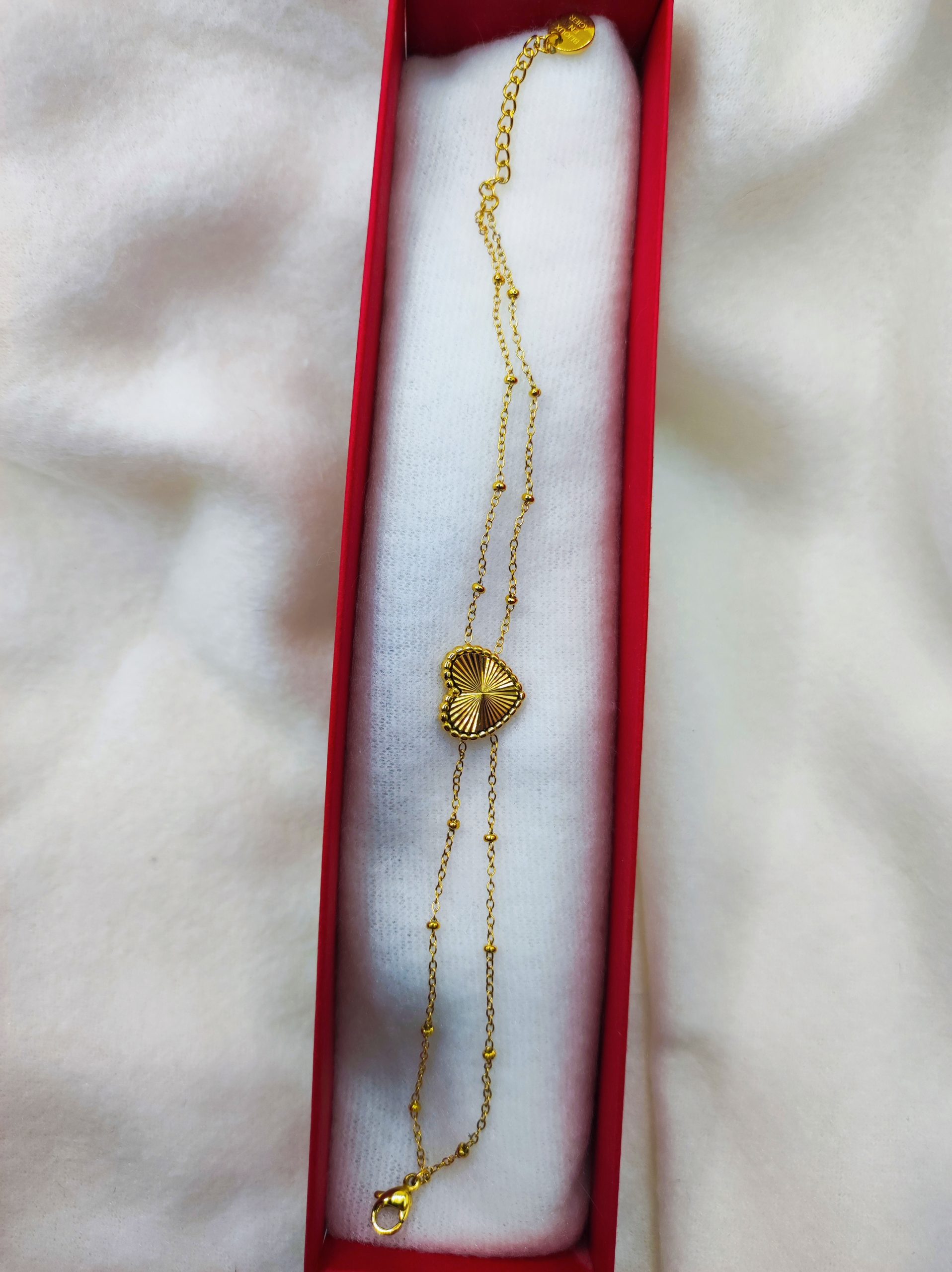Appréciez ce bracelet en acier inoxydable de couleur doré, où la chaîne et le cœur sont finement ouvragés. Chaque détail est soigneusement conçu pour un effet visuel poignant. Prenez le temps de l’admirer et découvrez les détails exquis et harmonieux qui ajoutent une touche de distinction et de charme à ce magnifique bijou.