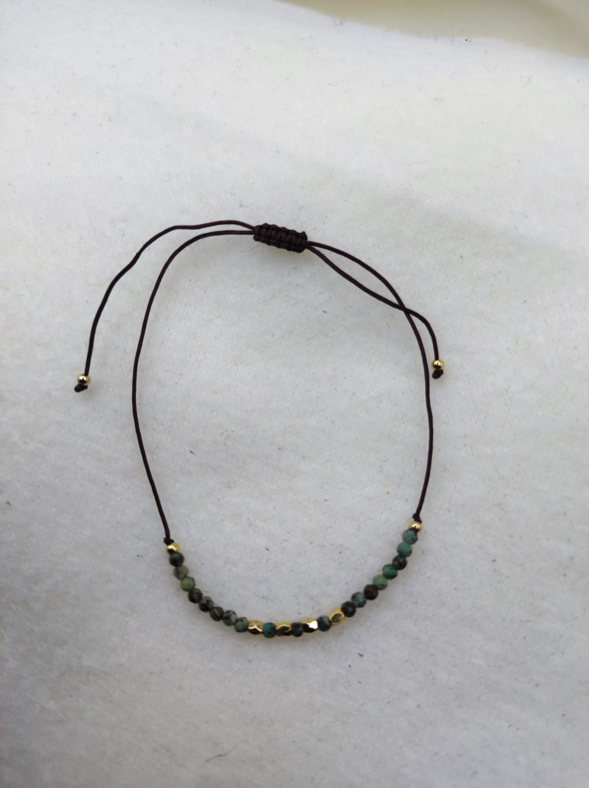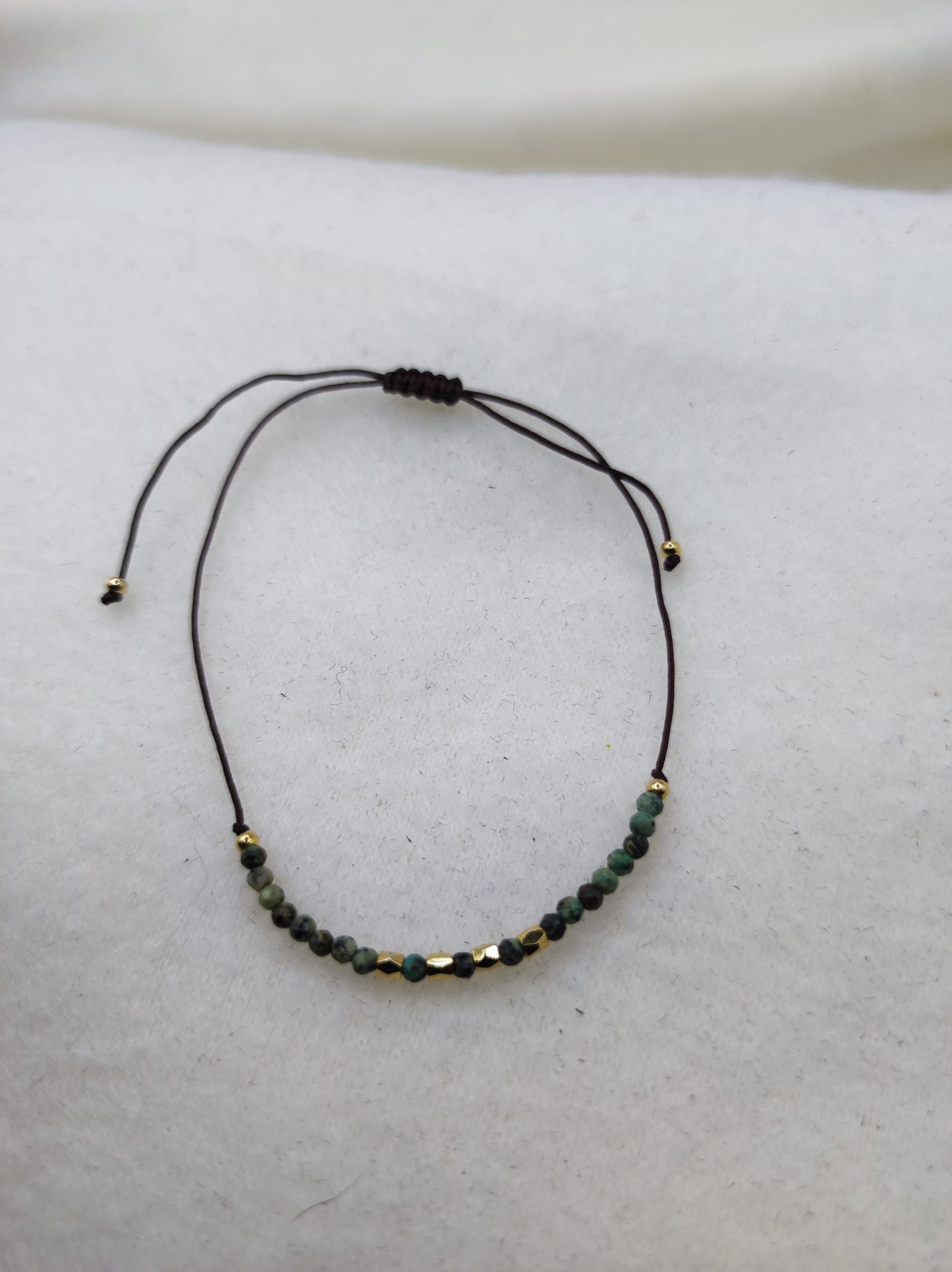 Beau bracelet très fin et discret composé de jolies petites perles vertes et dorés. La couleur verte symbolise l’équilibre, la croissance et la fraîcheur. Laissez vous porter par ce ravissant bijou qui ajoutera une touche d’élégance, de féminité et de grâce à votre tenue.