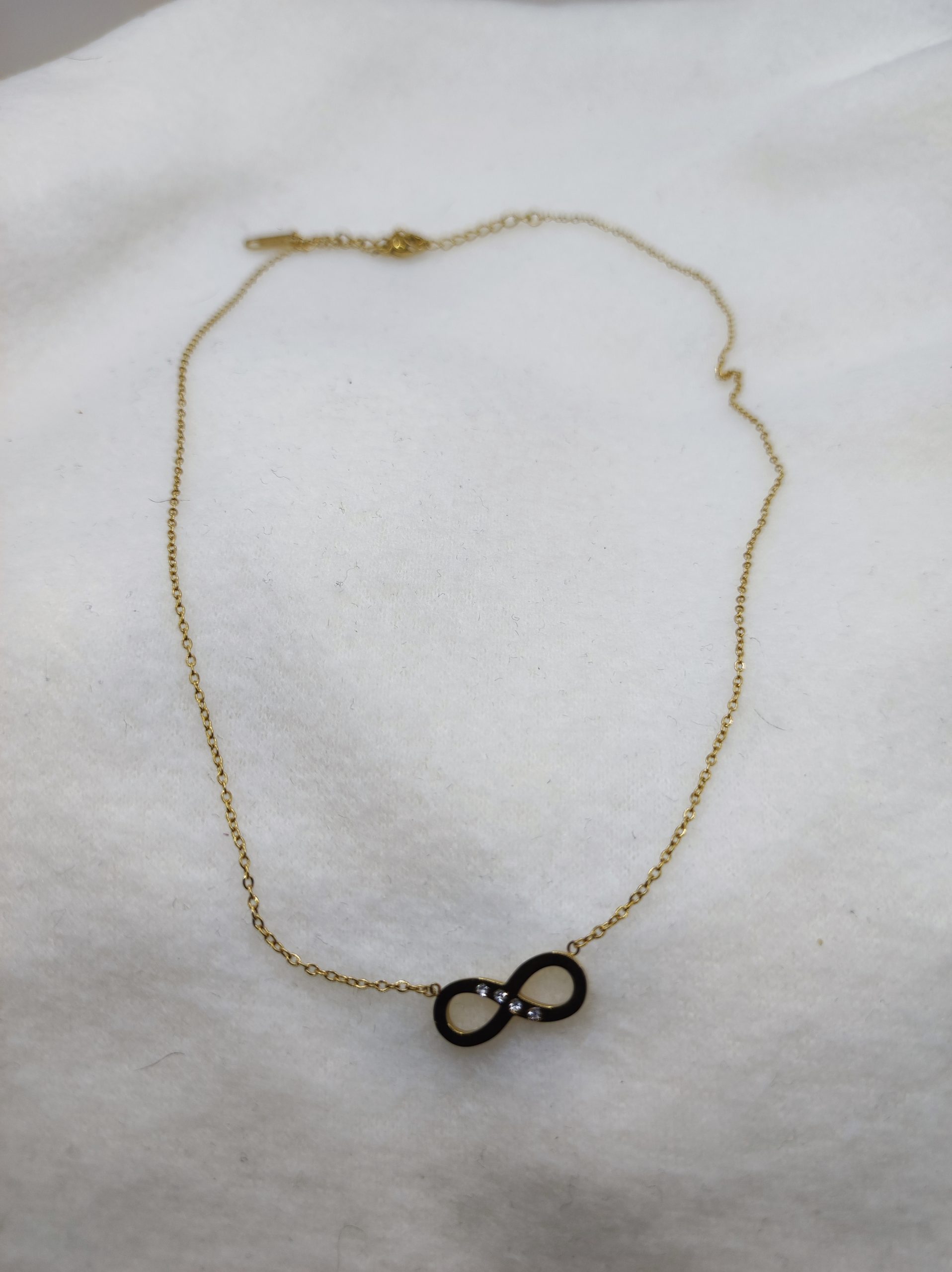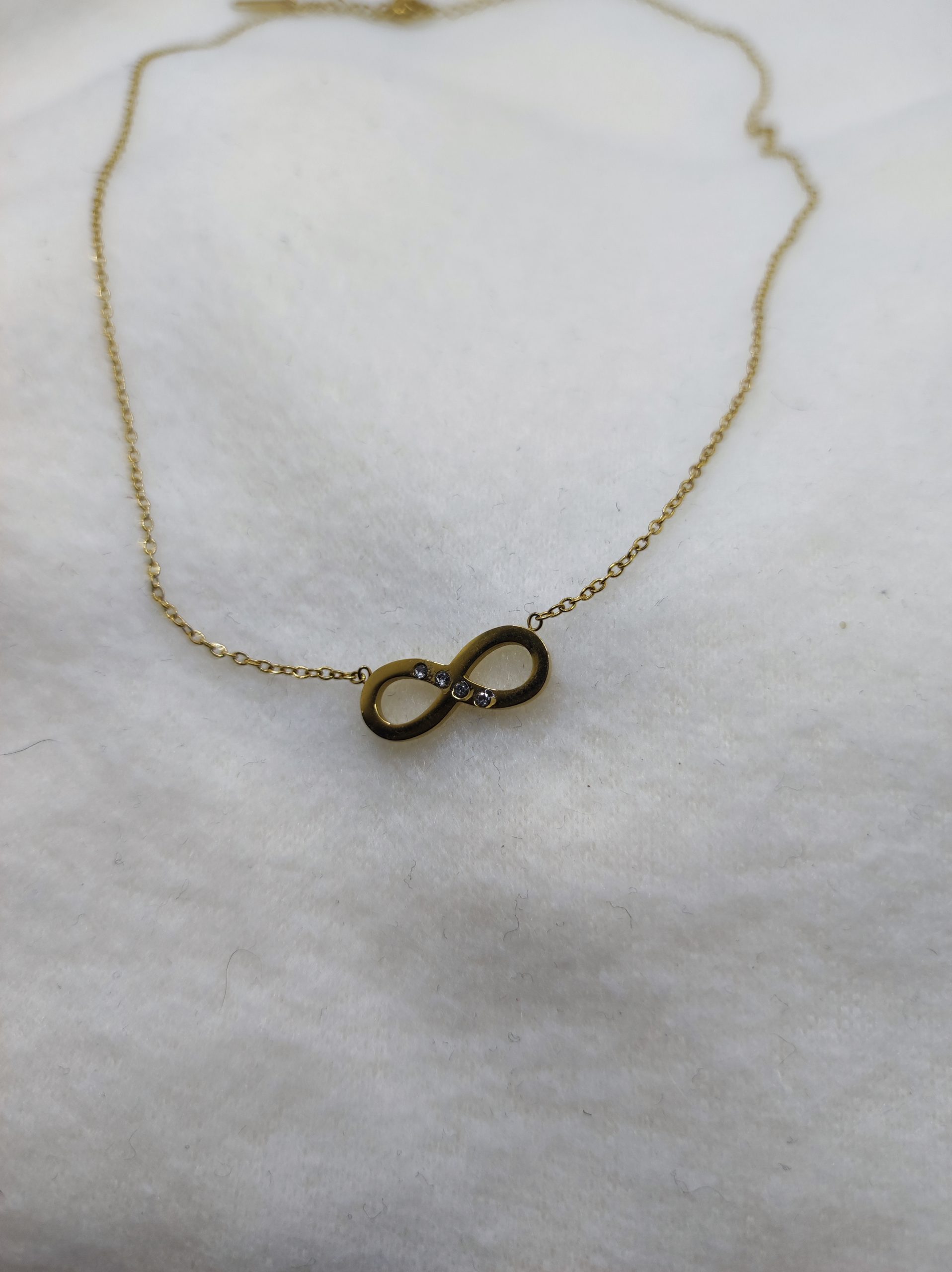 Découvrez ce magnifique collier en acier inoxydable de teinte dorée, délicatement façonné en forme du symbole de l’infini contenant de beaux petits strass brillants. Ce bijou élégant capture l’éternité et la beauté intemporelle à travers son design symbolique et ses détails scintillants.